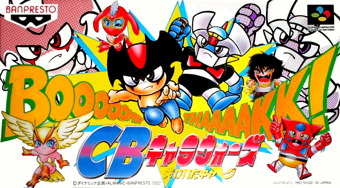 Witness an epic crossover battle in CB Chara Wars: Gekitotsu! Dengeki Logan for the Super Famicom. This unique Japanese import fighting game brings together chibi versions of iconic characters from beloved anime and manga series like Gundam, Mazinger Z, and Devilman. Engage in fast-paced, quirky combat with a roster of super-deformed heroes and villains, each with their own special moves. It's a fun and nostalgic brawler for fans of classic Japanese animation.