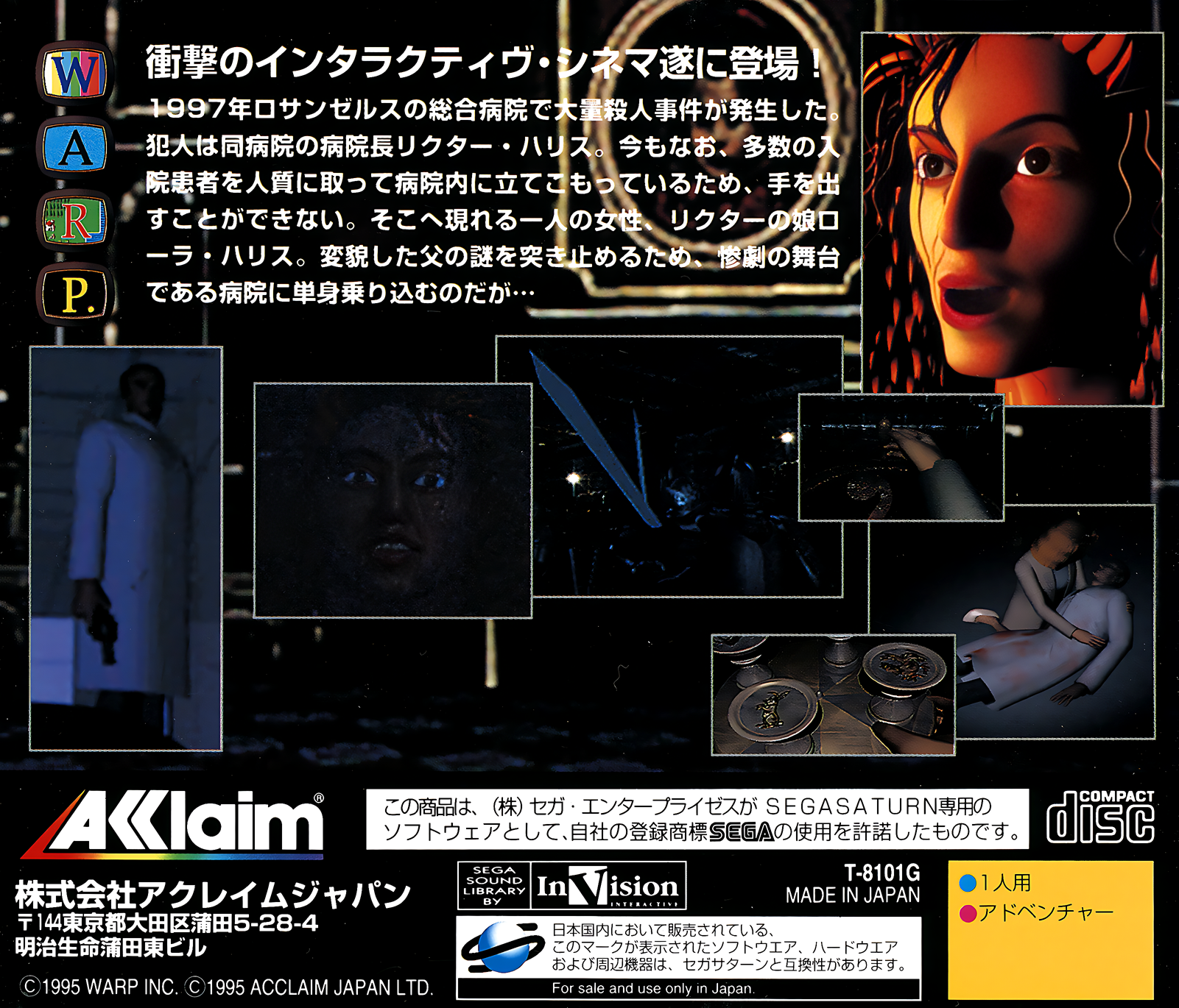 Step into a chilling interactive horror movie with D no Shokutaku on the JP Sega Saturn. In this pioneering adventure game, also known as "D," you assume the role of Laura Harris, who is summoned to a Los Angeles hospital where her father has barricaded himself after a killing spree. The game utilizes full motion video (FMV) and pre-rendered 3D environments to create a cinematic experience unlike any other of its time. With a strict two-hour real-time limit to solve the mystery and multiple endings, this title delivers a tense, atmospheric journey into the macabre.