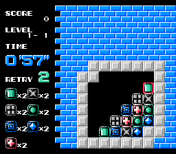 Get ready for a unique and challenging brain-teaser with Puzznic for the NES. This addictive puzzle game requires you to clear the screen of blocks by matching pairs of the same type. The catch? You can only move blocks horizontally, and they will fall until they hit the floor or another block. You'll need to think several steps ahead to strategically position and eliminate all the blocks before you run out of time. With its clever mechanics and increasingly difficult levels, Puzznic is a satisfying and engaging puzzler for those who love a mental workout.