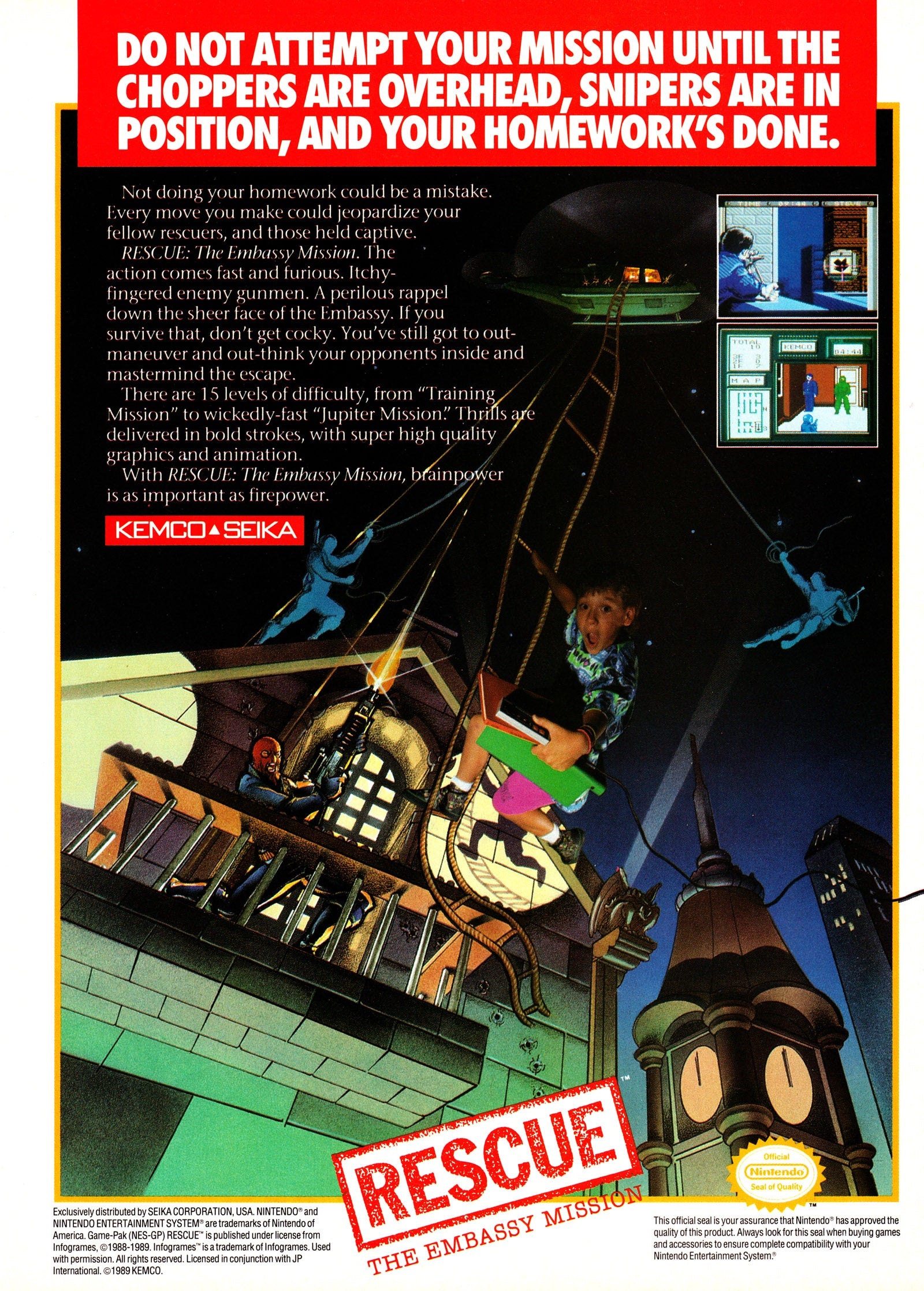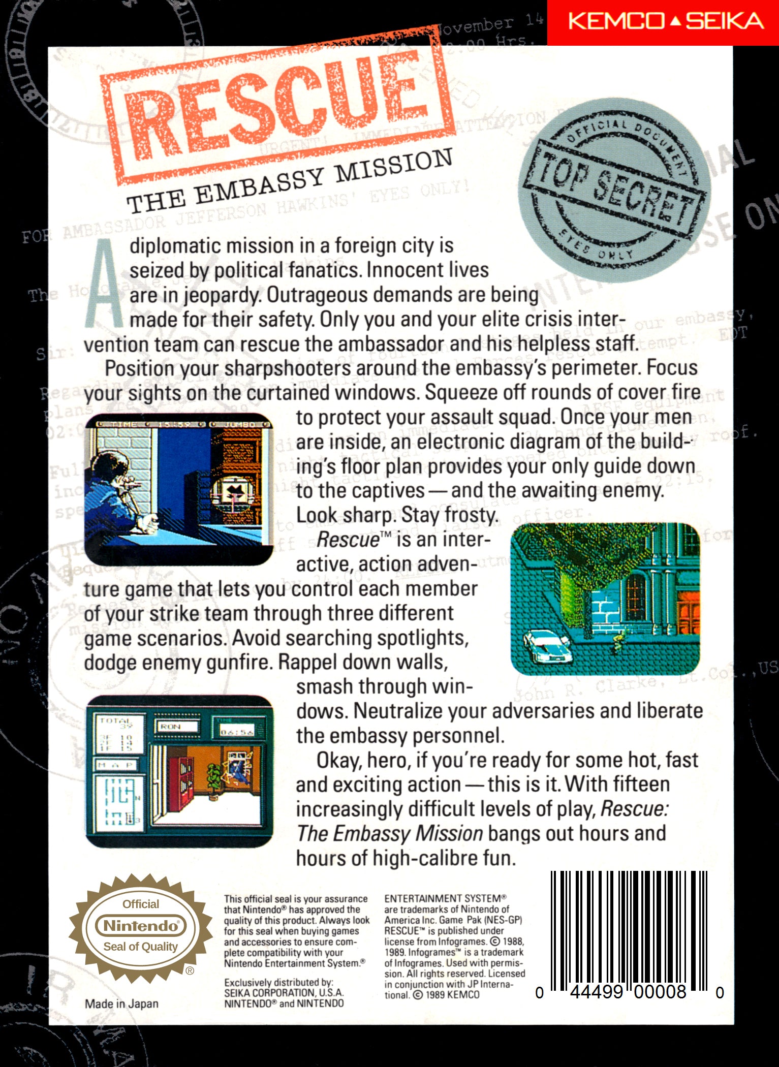 Infiltrate hostile territory and execute a daring rescue in Rescue the Embassy Mission for the NES. As a member of a highly trained special forces team, you must breach an embassy that has been taken over by terrorists. This classic action game, also known as Hostage: Rescue Mission, features multiple stages of gameplay that will test all your skills. You'll start by sniping enemies from a distance, then rappel down the side of the building, and finally engage in room-to-room, first-person combat to save the hostages. It’s a challenging and varied 8-bit mission that demands precision and courage.