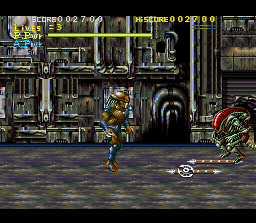 Whoever wins... we lose. Experience the epic sci-fi crossover in Alien vs Predator for the Super Nintendo. This action-packed, side-scrolling beat-'em-up puts you in the role of a deadly Predator warrior. When a Xenomorph infestation overruns a human colony, it is up to you to hunt down the alien queen and prove you are the ultimate hunter. Use your advanced wrist blades, shoulder cannon, and throwing disc to slice through waves of acid-blooded aliens. With its gritty graphics and satisfyingly brutal combat, this is a classic 16-bit brawler that brings the legendary conflict to life.