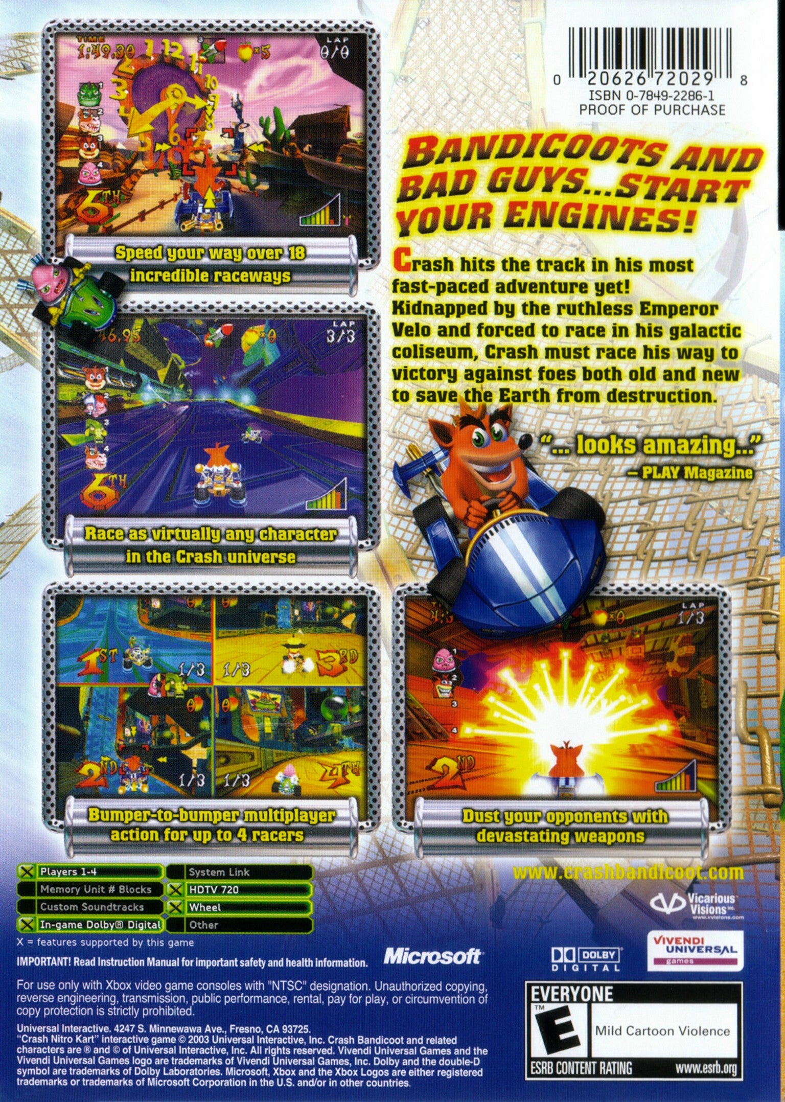 Jump back into the driver's seat for a high-speed, cartoon-fueled showdown! Crash Nitro Kart for the Xbox takes the beloved kart racing formula to the next level. Join Crash Bandicoot, Dr. Neo Cortex, and the entire cast as they're abducted by the alien Emperor Velo and forced to race for the fate of their planet. Speed through 17 imaginative tracks across four unique worlds, mastering power-slides and grabbing destructive Wumpa Fruit power-ups. Compete in the single-player Adventure Mode or challenge your friends to intense multiplayer battles. The race for intergalactic glory is on!