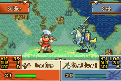 Command an army of heroes in the tactical fantasy epic Fire Emblem Sacred Stones for the GameBoy Advance. Set on the continent of Magvel, this strategy RPG follows royal twins Eirika and Ephraim as they struggle to reclaim their homeland of Renais from the invading Grado Empire. Players must guide units across grid-based maps, carefully managing weapon durability and the classic weapon triangle system to gain the upper hand. This installment introduces a branching class promotion system and a traversable world map, allowing for grinding and side battles. With permadeath raising the stakes for every decision, you must build strong relationships between your characters and devise flawless strategies to restore peace to the realm.