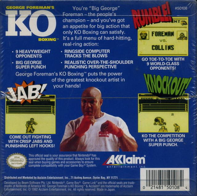 Step into the ring with a boxing legend in George Foreman's KO Boxing for the GameBoy. Lace up your gloves and get ready to trade punches in this classic handheld fighting game. Work your way up the ranks, facing a series of increasingly difficult opponents, on your path to challenge the heavyweight champion himself, George Foreman. You'll need to master your jabs, hooks, and uppercuts while carefully managing your stamina to survive each round. It's a pure and challenging boxing experience that brings all the hard-hitting action right to the palm of your hand.