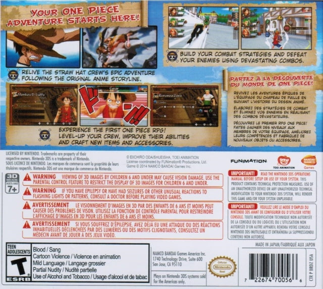 Set sail for the Grand Line in One Piece: Romance Dawn for the Nintendo 3DS. This role-playing game retells the early adventures of Monkey D. Luffy, from his departure from Windmill Village up to the epic Battle of Marineford. Players experience the story through 3D cutscenes and manga-style panels. The combat utilizes a "Grand Tactical Battle" system, a turn-based hybrid where you move freely within a designated area to line up attacks and execute signature moves like the Gum-Gum Pistol. As you level up the Straw Hat Pirates, you can craft items and customize their abilities. Relive the emotional highs and intense battles of the series' origin in this portable adventure.