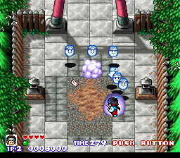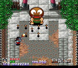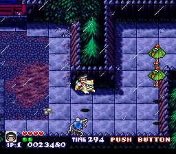 Team up for a charming yet intense shoot-'em-up adventure in Pocky & Rocky for the Super Nintendo. You control Pocky, a Shinto shrine maiden, or Rocky, her tanuki companion, as they battle through waves of yokai and mythological monsters to save the Nopino Goblins. Unlike traditional scrolling shooters, this game allows for eight-way movement and combines ranged projectile attacks with close-quarters melee swipes and deflections. The colorful, anime-inspired graphics hide a surprisingly challenging arcade experience. With a cooperative two-player mode, you and a friend can combine forces to exorcise the Black Mantle in this cult-classic gem known for its tight gameplay and beautiful 16-bit sprite work.