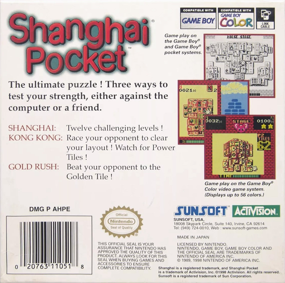 Relax with the ancient tile-matching game in Shanghai Pocket for the GameBoy Color. This portable version of the classic Mahjong Solitaire puzzle game challenges you to clear the board by matching pairs of identical tiles. The "Pocket" edition features the traditional turtle layout along with several other tile formations to test your observation skills. Players can choose from different tile sets for better visibility on the small screen. With its simple, addictive gameplay loop and calm pacing, it is the perfect puzzle game for short bursts of play to sharpen your mind and unwind.