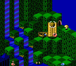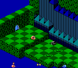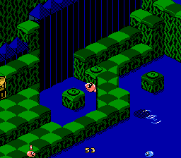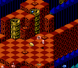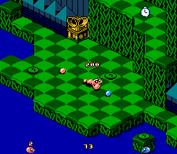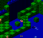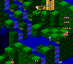 Slither and slide your way through a bizarre isometric world in Snake Rattle 'n' Roll for the NES. As the hungry snake Rattle or Roll, your goal is to gobble up enough "Nibbley Pibbleys" to gain enough weight to ring a bell and open the exit to the next level. This quirky and challenging action-puzzle game requires you to navigate treacherous 3D platforms while avoiding a host of wacky enemies. With its vibrant graphics, catchy soundtrack, and addictive gameplay, it stands as a unique and beloved classic from the 8-bit era.