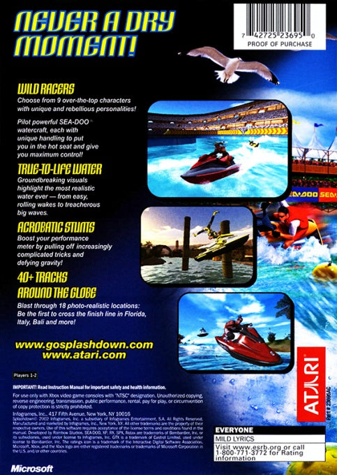 Hit the waves for some intense personal watercraft racing in Splashdown for the Xbox. Choose your Sea-Doo and compete on a variety of exotic and challenging courses, from tropical islands to Venice canals and even an alien water world. Master trick execution to gain a competitive edge, navigate rough waters effectively, and battle aggressive AI opponents who will stop at nothing to win. The Xbox version features enhanced graphics and smoother performance, delivering a visually impressive and fluid racing experience for fans of extreme water sports and arcade action.