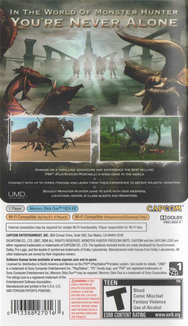 The ultimate portable hunting experience returns with Monster Hunter Freedom Unite for the PSP. This massive expansion of Monster Hunter Freedom 2 features an incredible roster of monsters, countless quests, and a vast arsenal of weapons and armor to craft. Team up with friends via ad-hoc multiplayer to take on the toughest challenges in this deep and incredibly rewarding action RPG. Prepare for hundreds of hours of thrilling hunts!