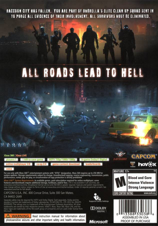Relive the chaos of the Raccoon City incident as an Umbrella operative or US Special Forces soldier in Resident Evil: Operation Raccoon City for the Xbox 360. This team-based third-person shooter plunges you into the heart of the T-virus outbreak, battling hordes of zombies, iconic Bio-Organic Weapons, and opposing human forces. Choose your side, utilize unique character abilities, and complete objectives in familiar yet reimagined Raccoon City locations. Operation Raccoon City offers an action-focused twist on the Resident Evil universe, emphasizing squad combat and brutal encounters.