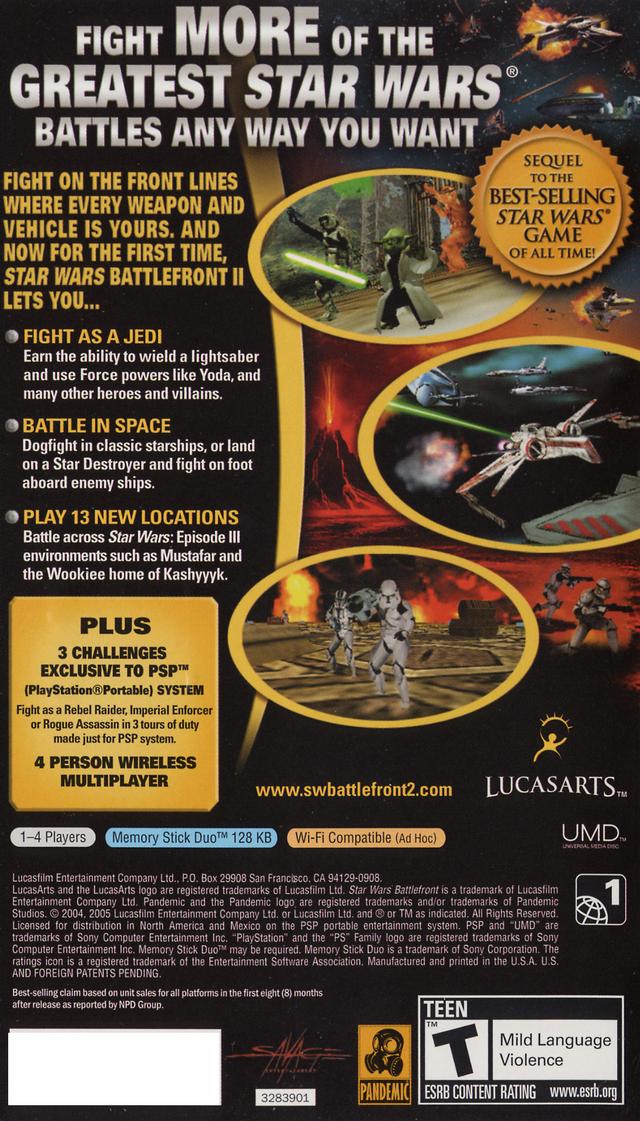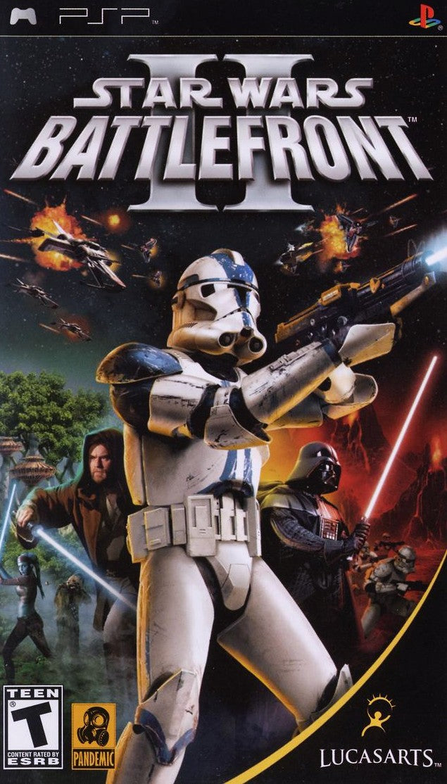 Take the galactic conflict on the go with Star Wars: Battlefront II for the PSP. This portable version of the acclaimed shooter allows you to engage in large-scale battles across various iconic Star Wars locations. Play as infantry, pilot vehicles, and even take control of legendary heroes and villains. Experience both ground assaults and space combat, and enjoy a robust single-player campaign mode. Battlefront II on PSP delivers a comprehensive and engaging Star Wars combat experience tailored for handheld play, offering hours of galactic warfare in your pocket.