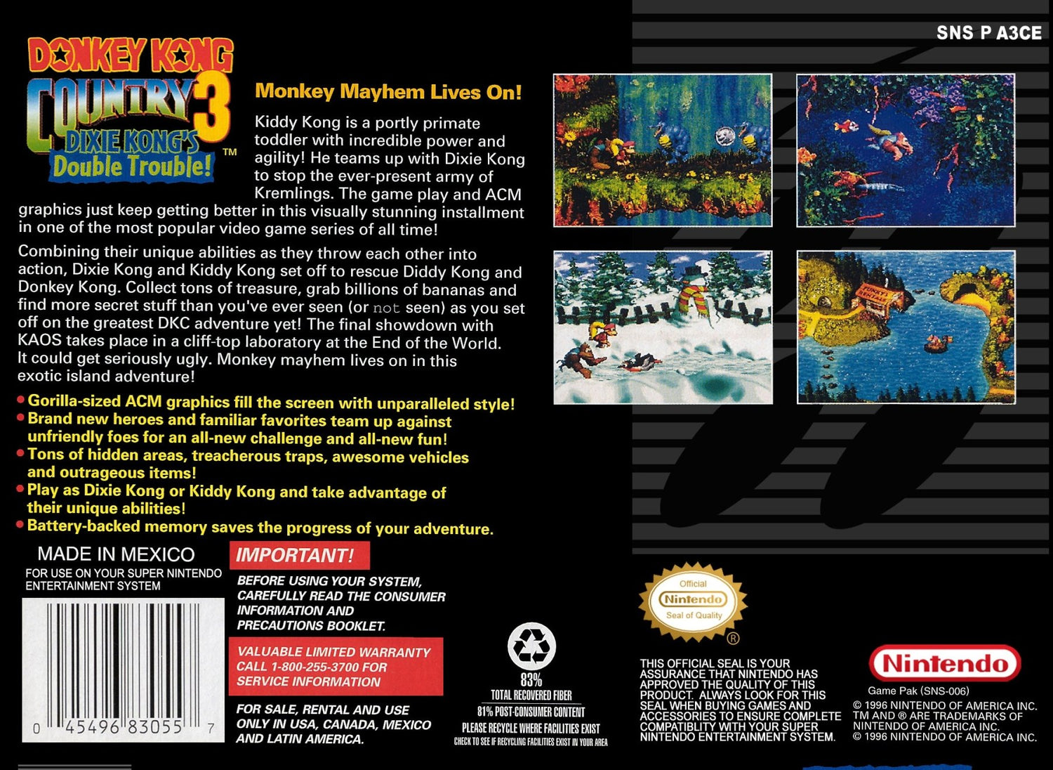 Explore the vast Northern Kremisphere in Donkey Kong Country 3: Dixie Kong's Double Trouble! for the Super Nintendo. With Donkey and Diddy Kong missing, it's up to Dixie Kong and her massive baby cousin, Kiddy Kong, to save the day. This sequel features even larger levels, new animal buddies, and a host of hidden secrets. It's a challenging and expansive 16-bit platforming adventure.