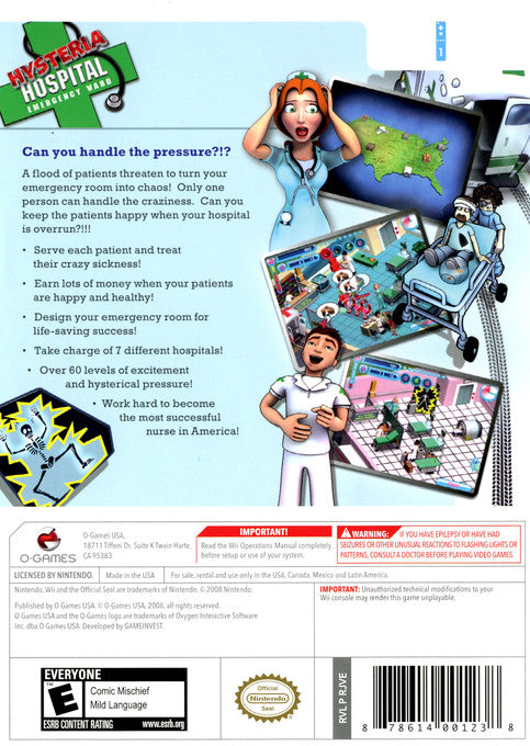 Manage a chaotic hospital and treat bizarre patients in Hysteria Hospital: Emergency Ward for the Wii. This time-management simulation game puts you in charge of a busy emergency room. Diagnose and cure a variety of comical ailments, upgrade your hospital facilities, and keep your patients happy. Utilize the Wii Remote for intuitive controls as you race against the clock to save lives and maintain order in this frantic and fun-filled medical adventure.