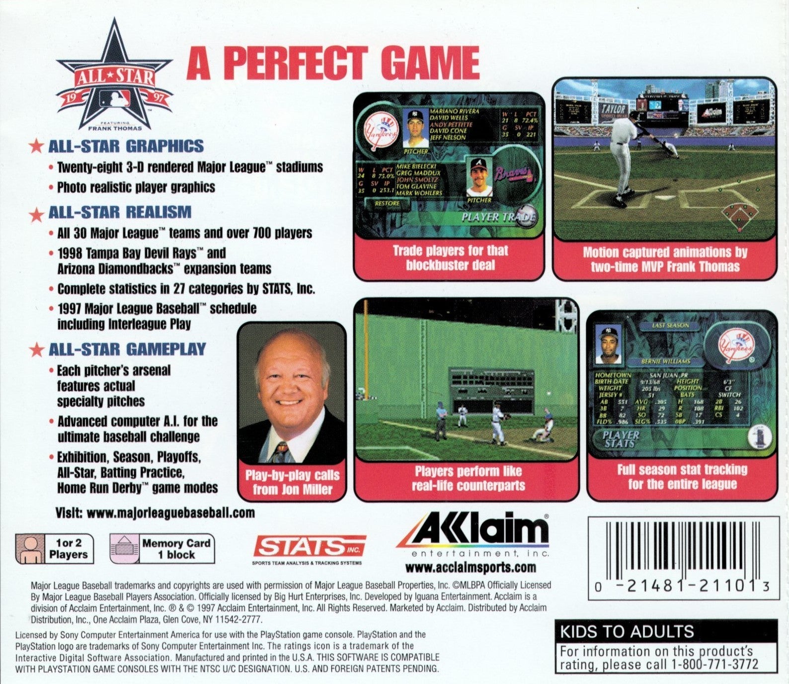 Experience the dawn of a classic baseball franchise with All-star Baseball 97 for the Playstation. This early 3D baseball simulation brought the excitement of Major League Baseball to the console with all the official teams and players of the era. With pioneering motion capture for player animations and a variety of game modes, it set the stage for one of the most respected baseball series of its generation. Step back in time and play ball!