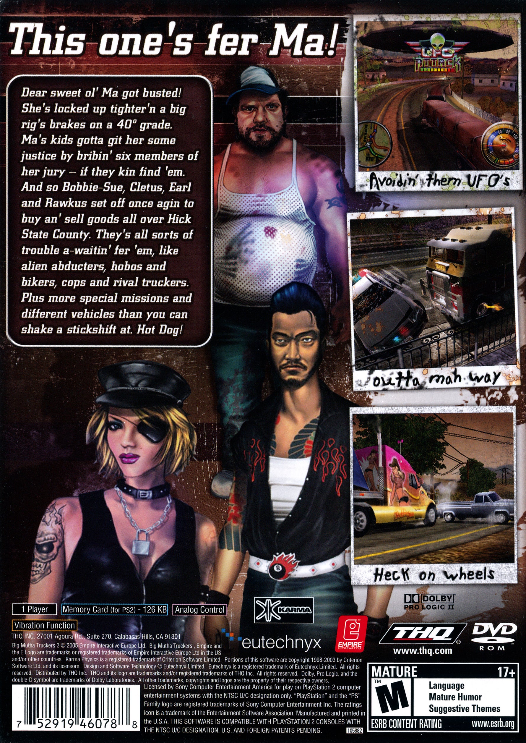 The Jackson family is back for more trucking mayhem in Big Mutha Truckers 2: Truck Me Harder for the Playstation 2. This time, Ma Jackson is in jail, and it's up to you to bribe the jurors to set her free. Earn cash by hauling cargo, smuggling illicit goods, and taking on a variety of side missions. With more vehicles, an expanded game world, and the same quirky humor, it's a bigger and bolder trucking adventure.