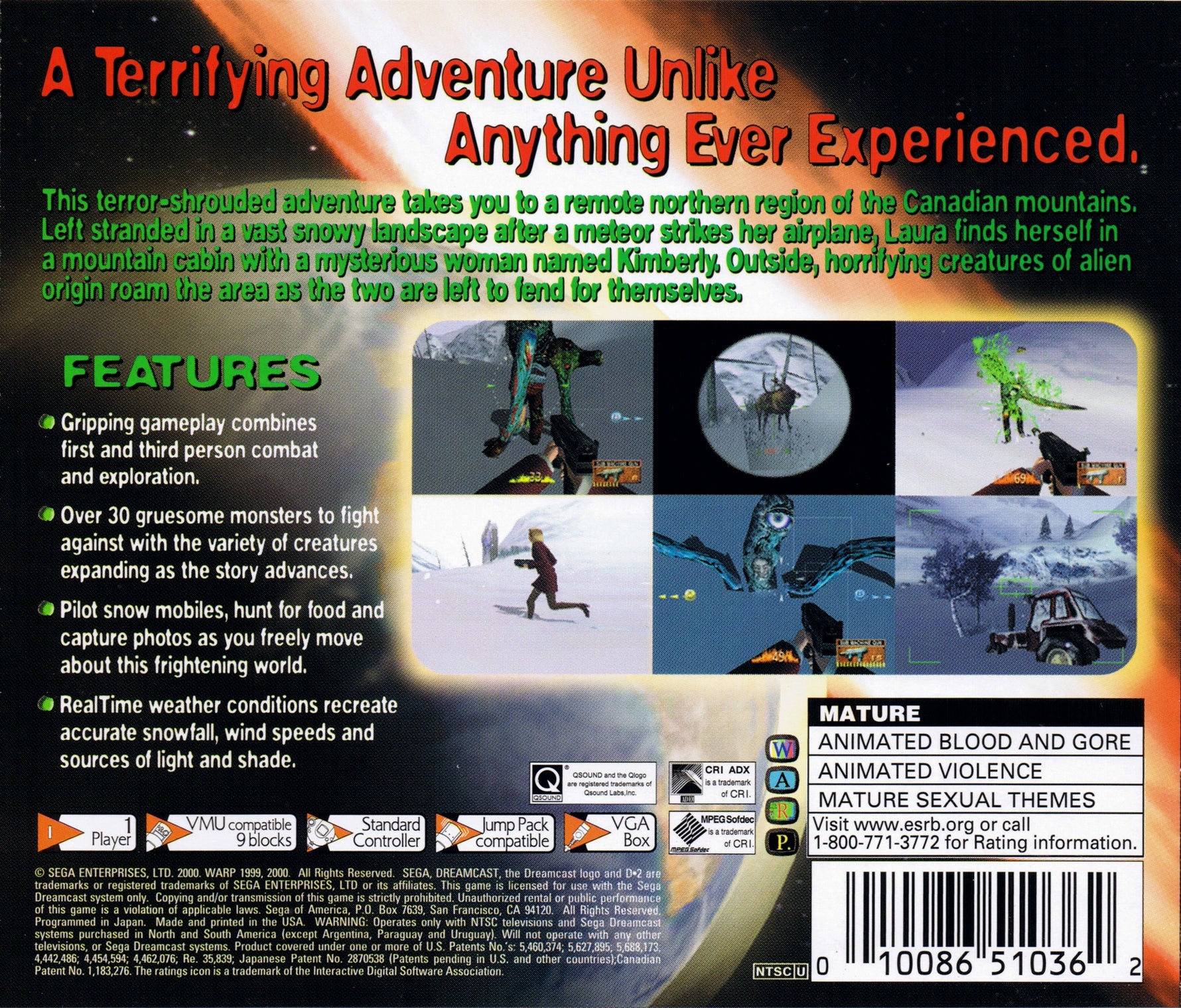 Brace yourself for a chilling journey into mystery and horror with D2 for the Sega Dreamcast. After surviving a catastrophic plane crash, you awaken as Laura Parton, an amnesiac stranded in the desolate Canadian mountains. This sprawling, cinematic adventure from legendary creator Kenji Eno masterfully blends the tense atmosphere of survival horror with deep RPG mechanics. Explore the vast, snow-covered wilderness, hunt wildlife to survive, and level up your skills. When grotesque, plant-like abominations emerge, the perspective shifts to intense, first-person shooter combat where every shot counts. Unravel a complex and surreal narrative in this unforgettable four-disc epic.