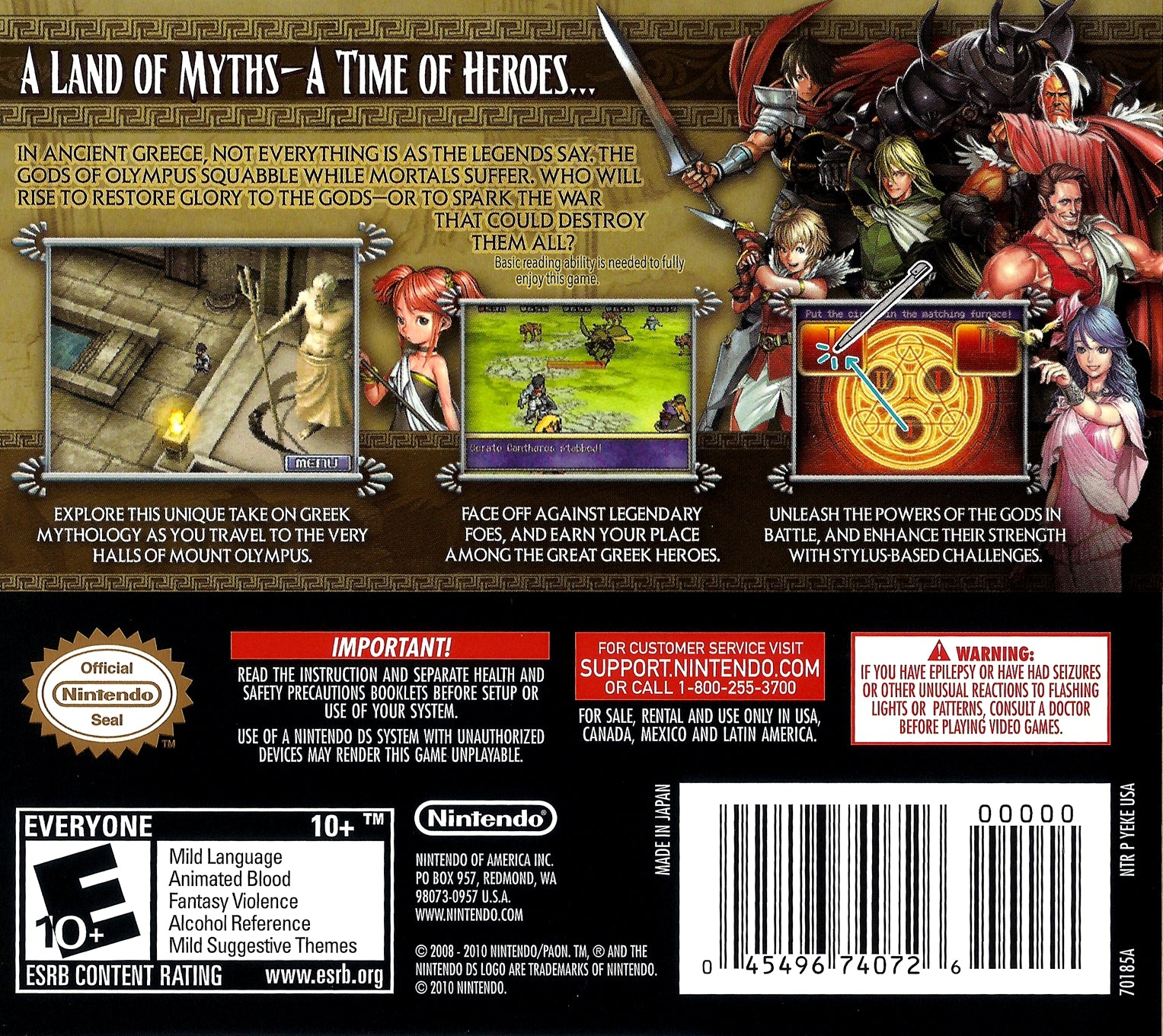 Embark on a quest inspired by Greek mythology in Glory of Heracles for the Nintendo DS. Join a band of immortal heroes, led by the enigmatic protagonist Heracles, as they journey through a vibrant world filled with mythical creatures, ancient gods, and hidden secrets. Engage in strategic turn-based combat, customize your party's skills, and unravel a captivating story of adventure and destiny. This RPG offers a unique blend of classic gameplay and mythological charm.
