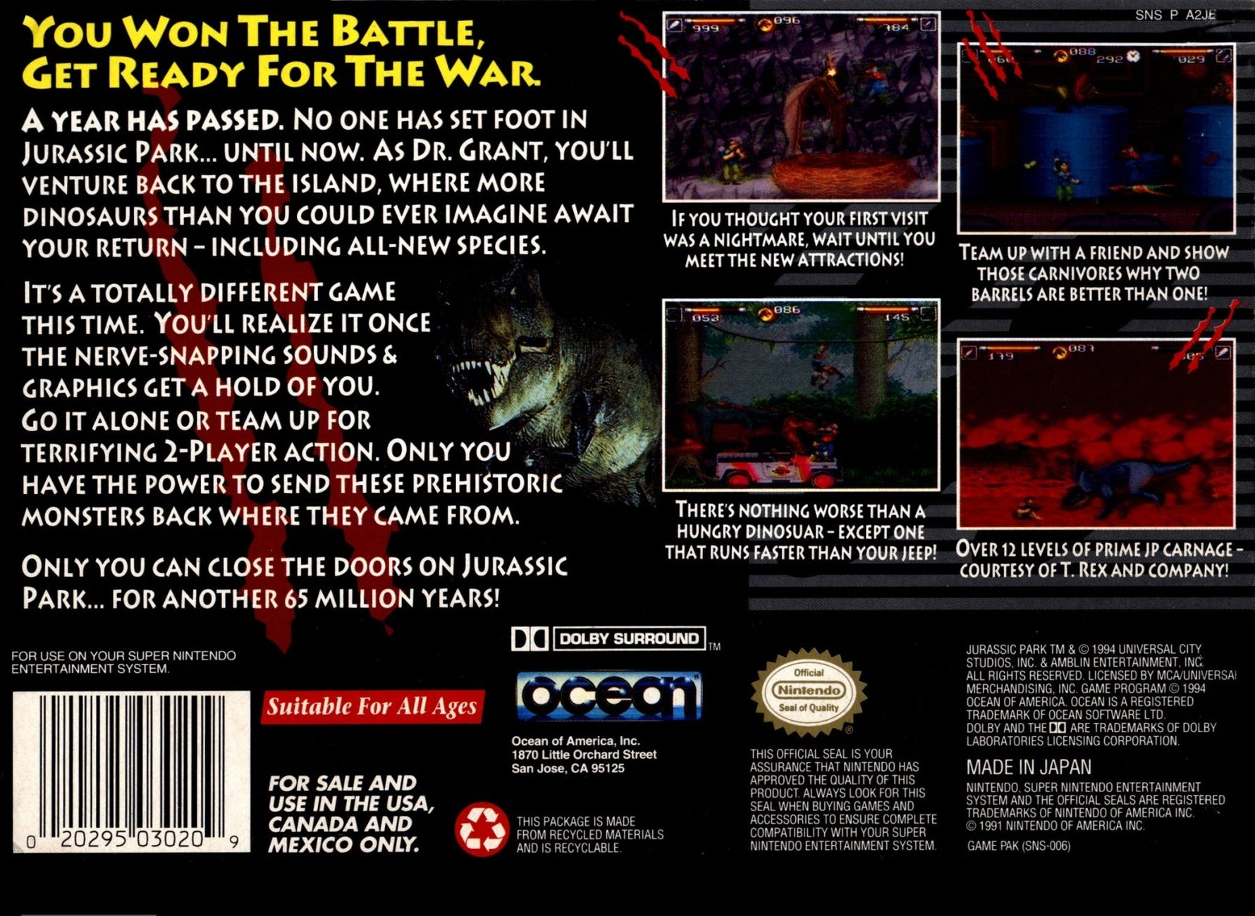 The chaos continues on Isla Nublar in Jurassic Park Part 2: The Chaos Continues for the Super Nintendo. Return to the dinosaur-infested island in this action-packed side-scrolling shooter, taking on heavily armed BioSyn mercenaries who are attempting to seize control. As Dr. Alan Grant, you'll battle through jungles, volcanic caves, and InGen facilities, utilizing a variety of weapons to fend off both human foes and a relentless onslaught of prehistoric predators. Prepare for a new level of intense Jurassic action!