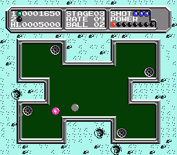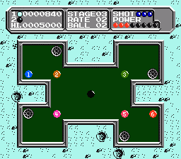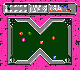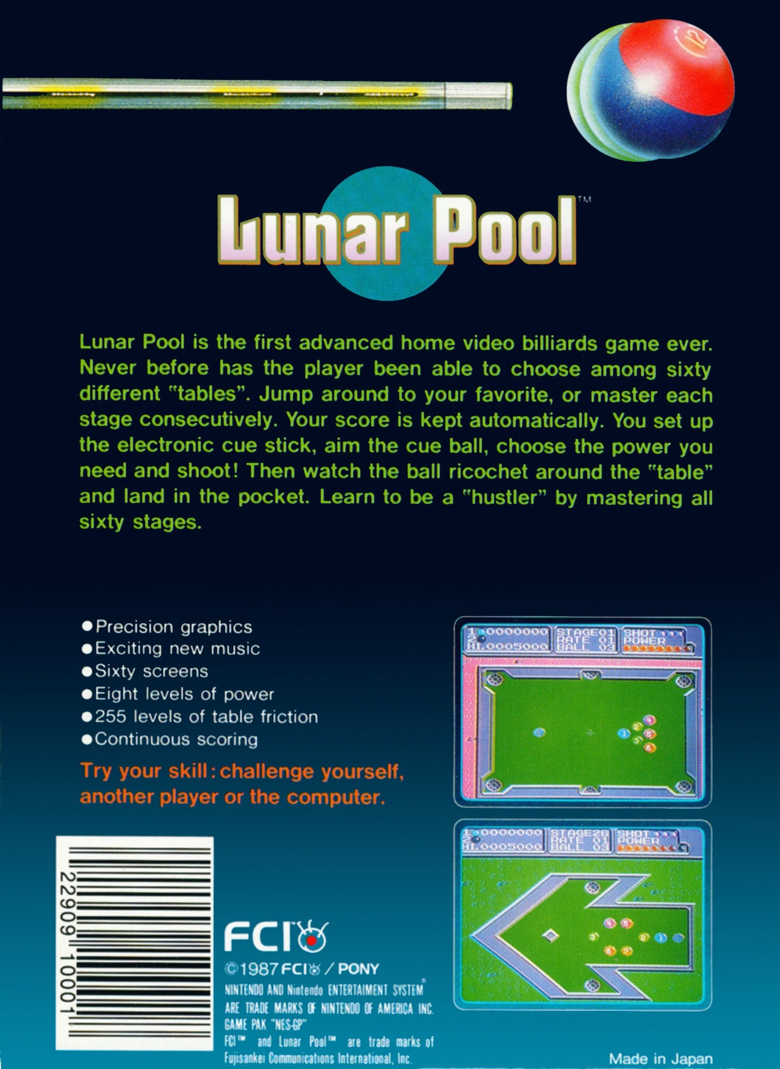 Test your trick-shot skills in Lunar Pool for the NES, a unique take on classic billiards. Navigate through 60 challenging, unconventionally shaped tables, sinking all the balls to advance. Adjust your shot power and angle carefully, contending with varying levels of friction. This retro title offers a quirky and surprisingly addictive puzzle-like billiards experience, perfect for players looking for a different kind of pool game.