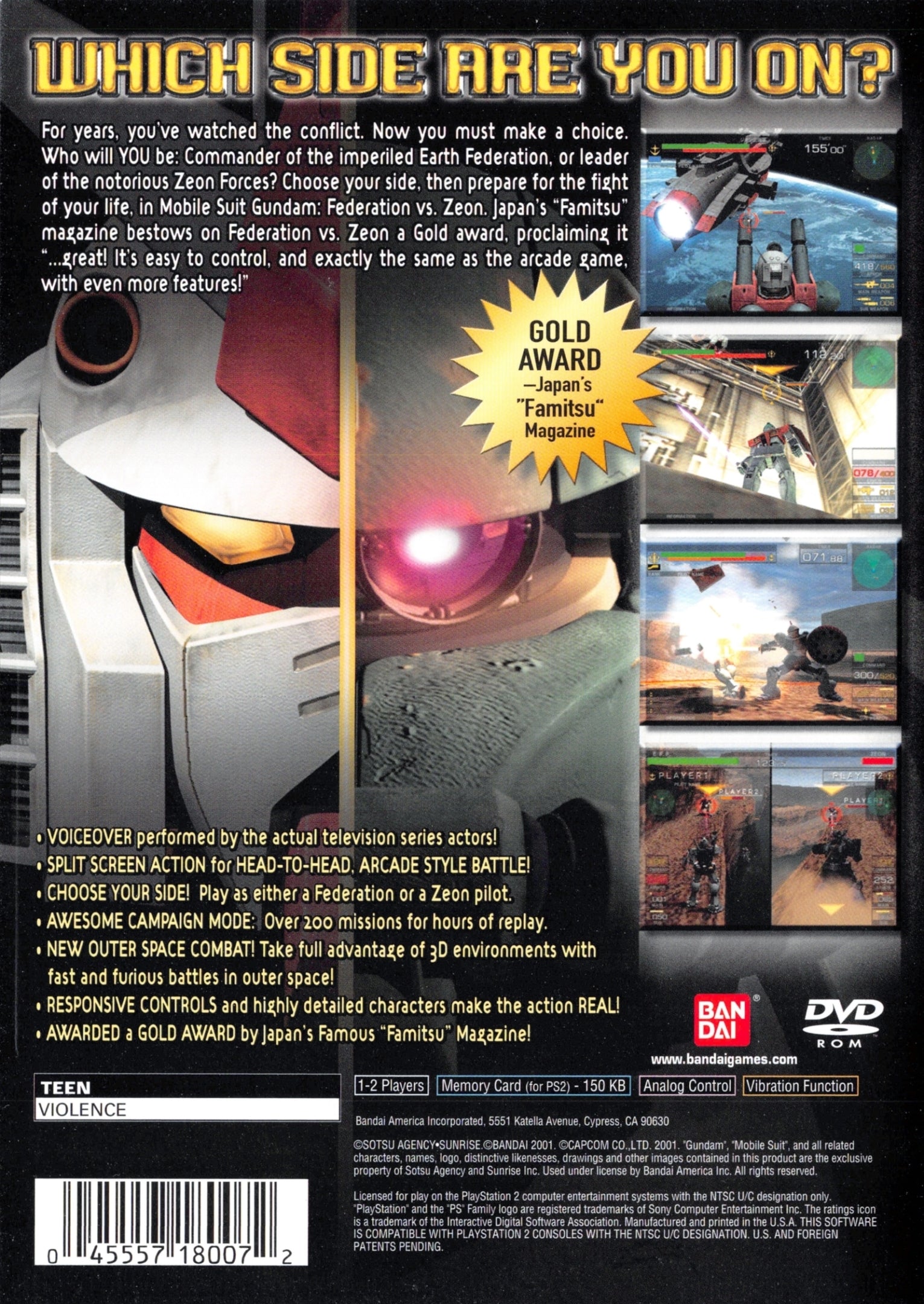 Choose your side and pilot iconic mechs in Mobile Suit Gundam: Federation vs. Zeon for the Playstation 2. This intense 3D action game drops you directly into the pivotal "One Year War" from the original Gundam universe. Enlist with either the Earth Federation or the Principality of Zeon and climb the ranks by completing critical missions. Master a variety of powerful Mobile Suits, each with unique weapons and abilities, in ground and space-based combat. Featuring a two-player split-screen mode, you can team up with or battle against a friend for control of the battlefield.