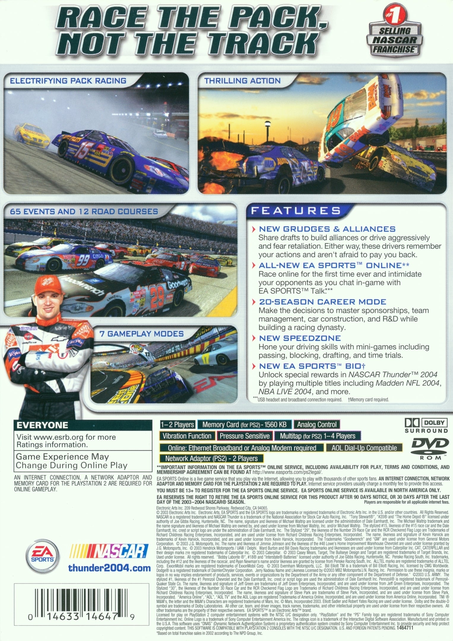 Dominate the track in NASCAR Thunder 2004 for the PlayStation 2. This critically acclaimed racing simulation introduces new features like Grudges and Alliances, where your on-track actions affect rivalries and partnerships. Experience refined car handling, a deep career mode where you build your own team, and intense, strategic pack racing on authentic NASCAR ovals.