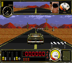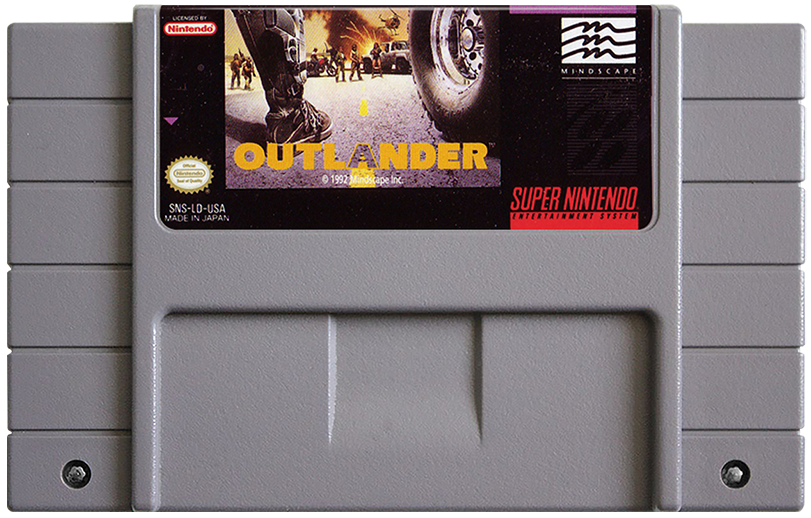Survive the brutal, post-apocalyptic future of the 21st century in Outlander for the Super Nintendo. This game combines high-speed, third-person driving combat with tense, side-scrolling action sequences, inspired by classic dystopian films. Behind the wheel of your armed-to-the-teeth muscle car, you'll blast bikers and run down obstacles on the desolate highways. Then, on foot, you'll navigate dangerous towns, scavenging for precious resources like food, water, and fuel while fighting off ruthless marauders. It's a dual-genre adventure that will test both your driving and survival skills in a world gone mad.