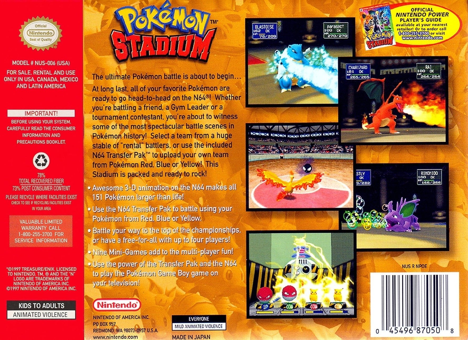 Bring your Pokémon battles to the big screen in Pokémon Stadium for the Nintendo 64. This groundbreaking title allows you to transfer your Pokémon from the Game Boy Pokémon Red, Blue, and Yellow games (via the separately sold Transfer Pak) and see them battle in stunning 3D. Compete in various cups and tournaments, challenge Kanto's Gym Leaders in Gym Leader Castle, and enjoy fun mini-games. While not a traditional RPG, Pokémon Stadium offers a thrilling way to experience strategic Pokémon battles with enhanced visuals and a grand arena atmosphere.