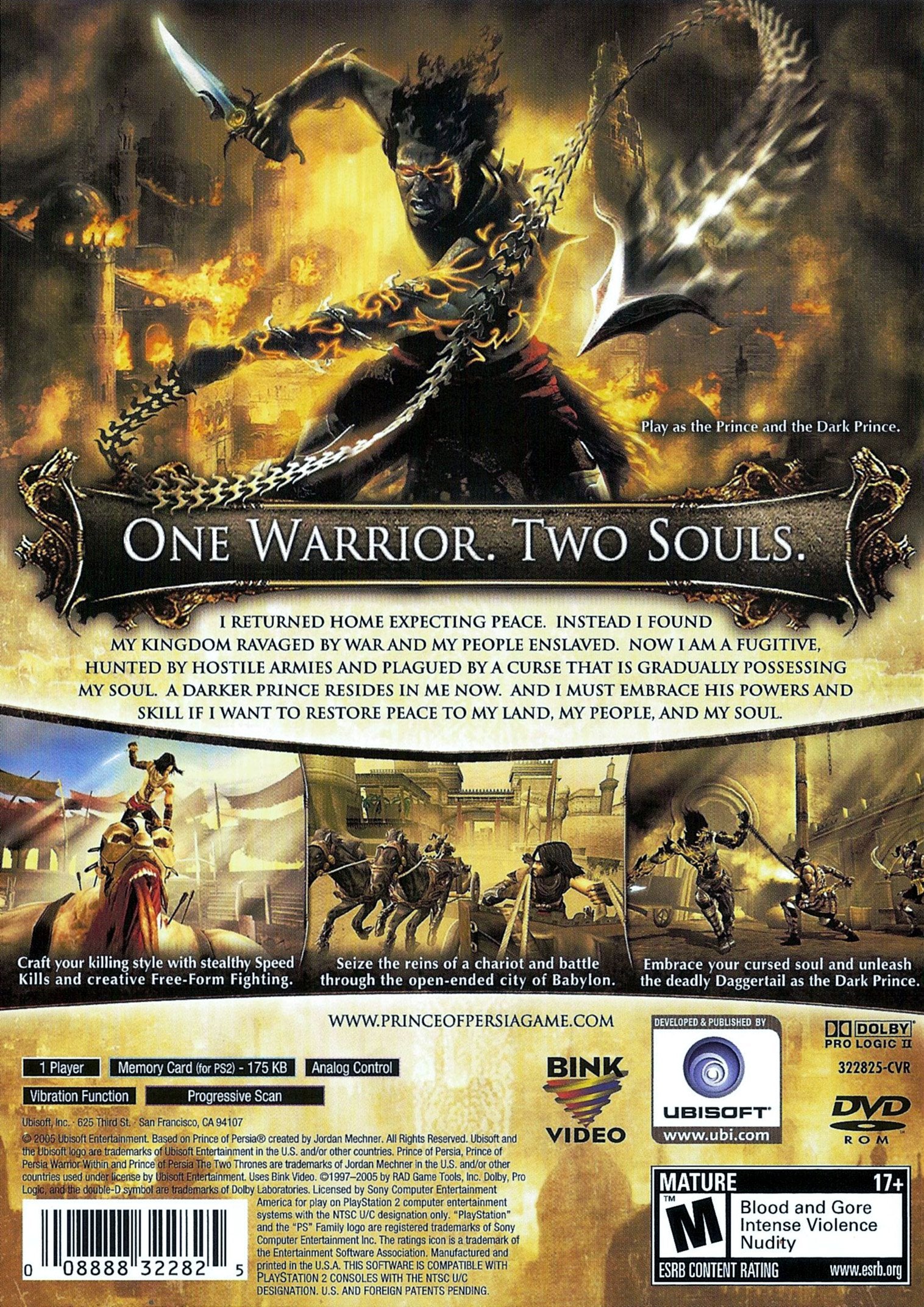 The Prince's dark journey concludes in the epic action-adventure, Prince of Persia: The Two Thrones for the Playstation 2. Returning to Babylon with the Empress of Time, the Prince finds his kingdom ravaged by war. In this thrilling finale, you must master two distinct personalities: the agile and skillful Prince, and his corrupted alter-ego, the Dark Prince, who wields the deadly Daggertail. Seamlessly switch between both characters, utilizing the Prince's acrobatic grace and the Dark Prince's brutal power to combat enemies and overcome incredible environmental challenges. Your final destiny awaits.