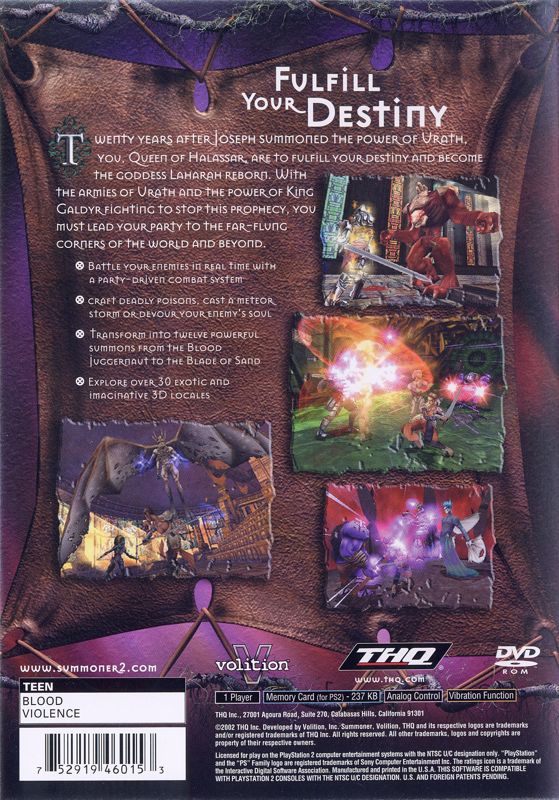 Become a goddess of war in Summoner 2 for the PlayStation 2. You are Maia, Queen of Halassar, who is not only a skilled fighter but also the vessel for the spirits of legendary Summons. As ancient forces threaten your kingdom, you must embark on an epic action RPG quest to master your incredible powers. This critically-acclaimed adventure features a fast-paced, real-time combat system where you can transform into 16 different summoned creatures, from massive beasts to powerful elementals. Explore a vibrant world, customize your party, and shape the destiny of a nation in this unforgettable fantasy saga.