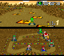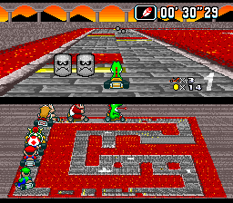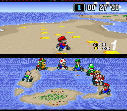 Corre hacia la acción con 'Super Mario Kart' en Super Nintendo. Únete a Mario y sus amigos en este icónico juego de carreras, lleno de pistas coloridas, potenciadores e intensa competencia multijugador.