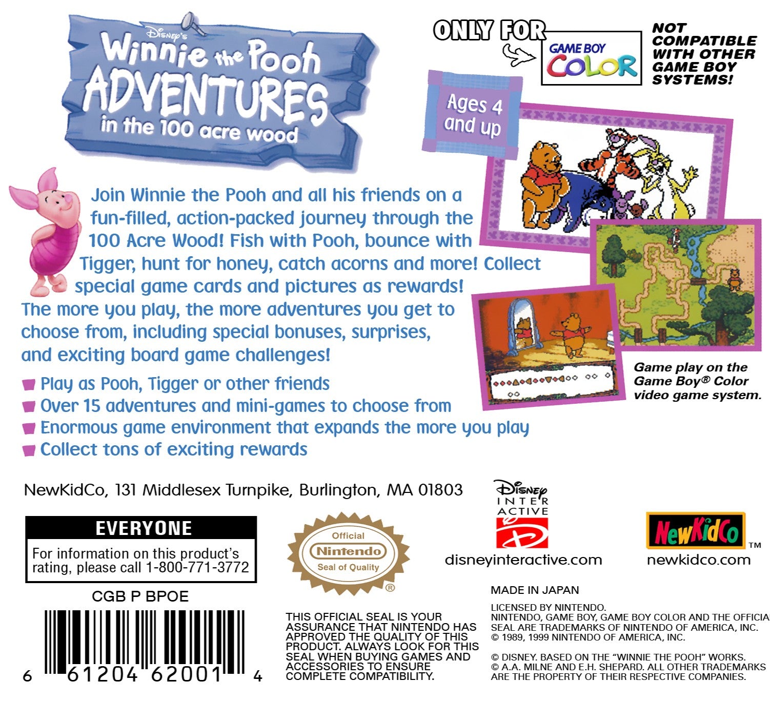 Ingrese al Bosque de los Cien Acres en 'Las aventuras de Winnie The Pooh en los Bosques de los 100 Acres' en GameBoy Color. Ayuda a Pooh y sus amigos a resolver acertijos y encontrar miel. ¿Puedes ayudar a Pooh en su fantástico viaje?