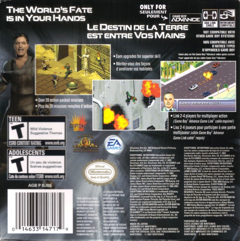 The name is Bond, James Bond, and your mission awaits in 007 Everything or Nothing for the GameBoy Advance. This action-packed title brings the thrill of espionage to the palm of your hand, featuring a unique top-down perspective. Engage in stealth missions, gadget-driven gameplay, and intense combat scenarios as you work to stop a global super-villain. Experience a classic Bond adventure with a distinctive handheld twist, perfect for spies on the go.