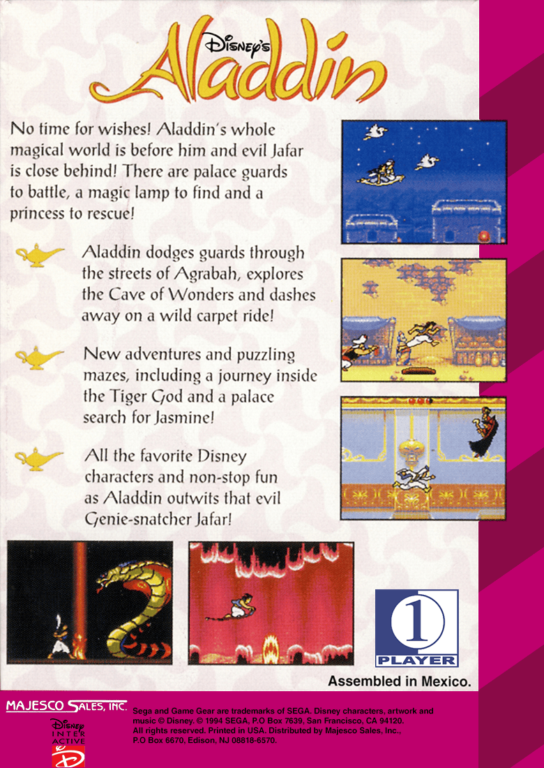 Embark on a magical carpet ride in 'Aladdin' on the Sega Game Gear. Join Aladdin on a platforming adventure through Agrabah, facing off against enemies and avoiding hazards. With vibrant visuals and classic gameplay, it's a Disney classic on the go.