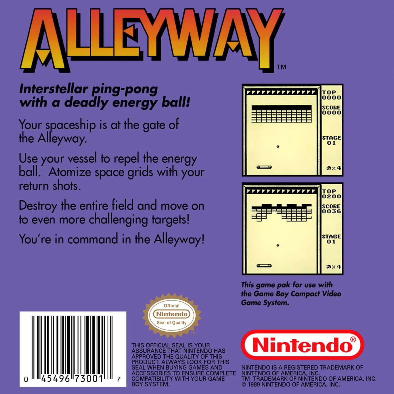 Experience a piece of handheld history with Alleyway for the GameBoy. As one of the original launch titles, this classic paddle-and-ball game challenges you to break through layers of bricks. Control Mario at the helm of a spaceship-like paddle, deflecting the ball to destroy blocks and clear each stage. With various block formations and bonus rounds, Alleyway offers simple, addictive, and timeless arcade fun.