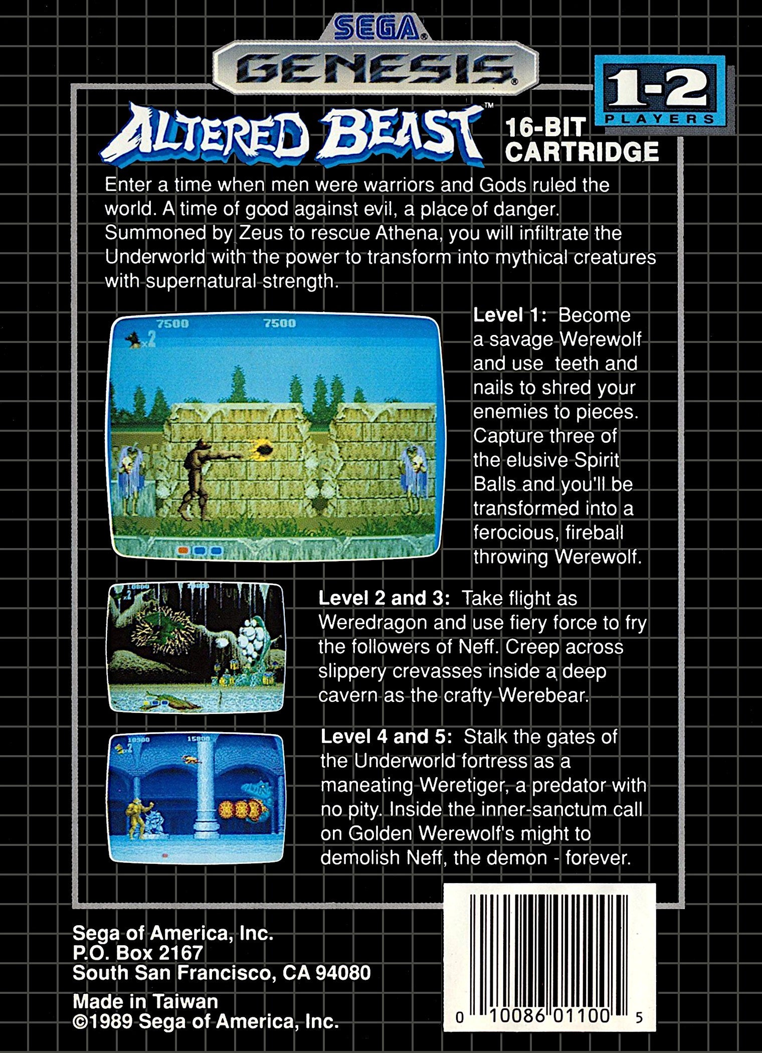 Rise from your grave and unleash the beast in the legendary arcade classic, Altered Beast for the Sega Genesis! Resurrected by Zeus himself, you are a fallen centurion tasked with rescuing the goddess Athena from the demon god Neff. In this iconic side-scrolling beat 'em up, you'll punch, kick, and smash your way through hordes of undead and monstrous foes. Collect powerful Spirit Ball power-ups to transform into a series of ferocious creatures—from a werewolf to a golden dragon—each with unique and devastating attacks. Experience a cornerstone of retro gaming history and prove your might to the gods!