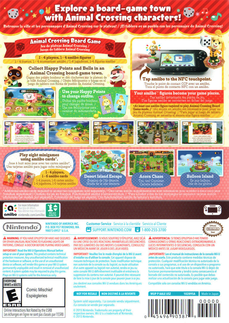 Roll the dice and join your favorite characters in Animal Crossing: Amiibo Festival for the Wii U. This digital board game brings the charming world of Animal Crossing to life in a fun, new way. Use your Animal Crossing amiibo figures to travel around the board, landing on spaces that trigger humorous events and activities. Collect Happy Points, invest in turnips, and enjoy a variety of mini-games in this lighthearted party experience perfect for the whole family.