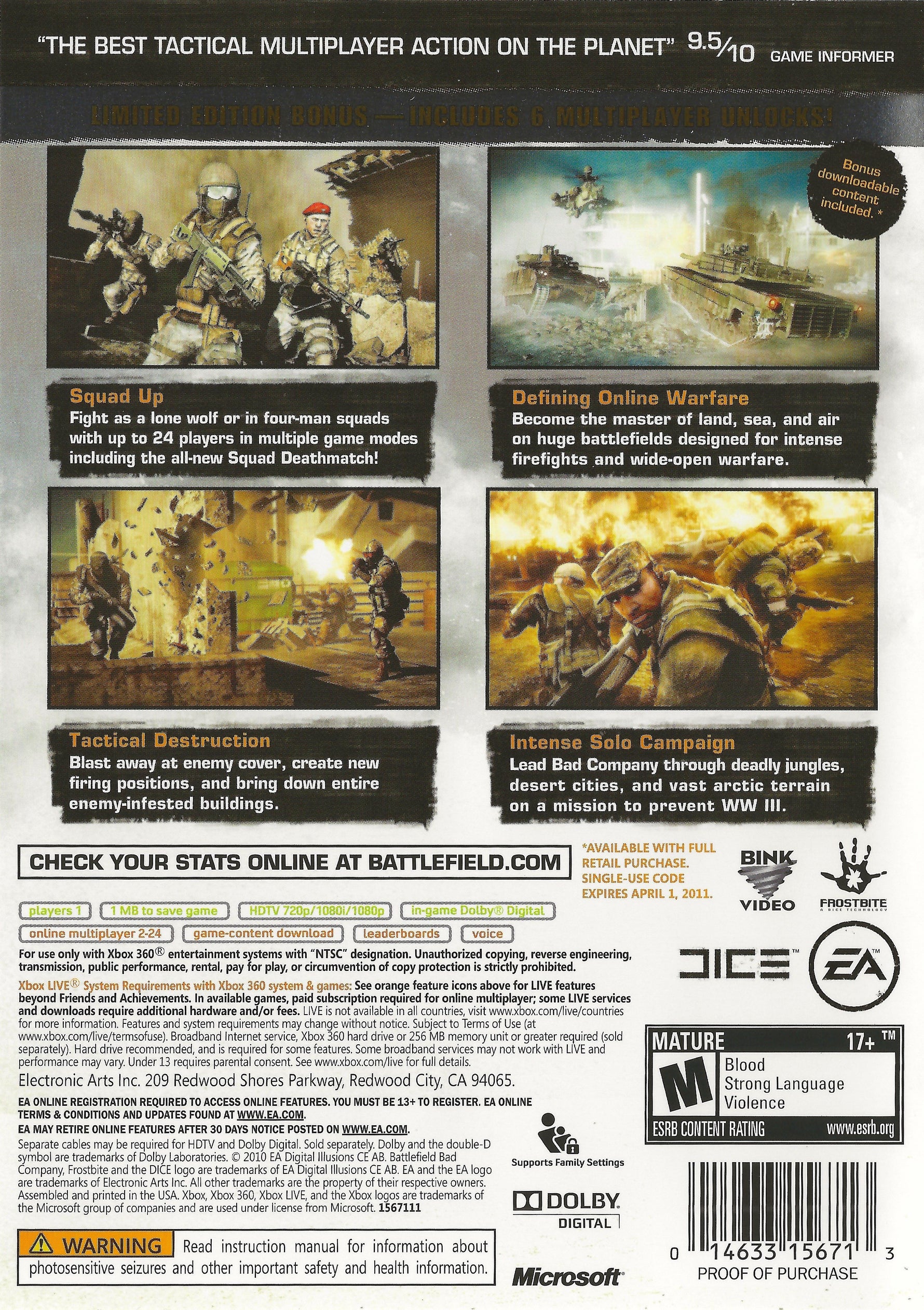 Prepare for more destruction and dark humor with Battlefield: Bad Company 2 for the Xbox 360. The misfit soldiers of B-Company are back in a new, globe-trotting single-player adventure. The game also refines the series' class-based multiplayer with enhanced squad mechanics and even more tactical destruction. Level entire buildings, blast holes in cover, and work with your squad to dominate in this critically acclaimed first-person shooter.