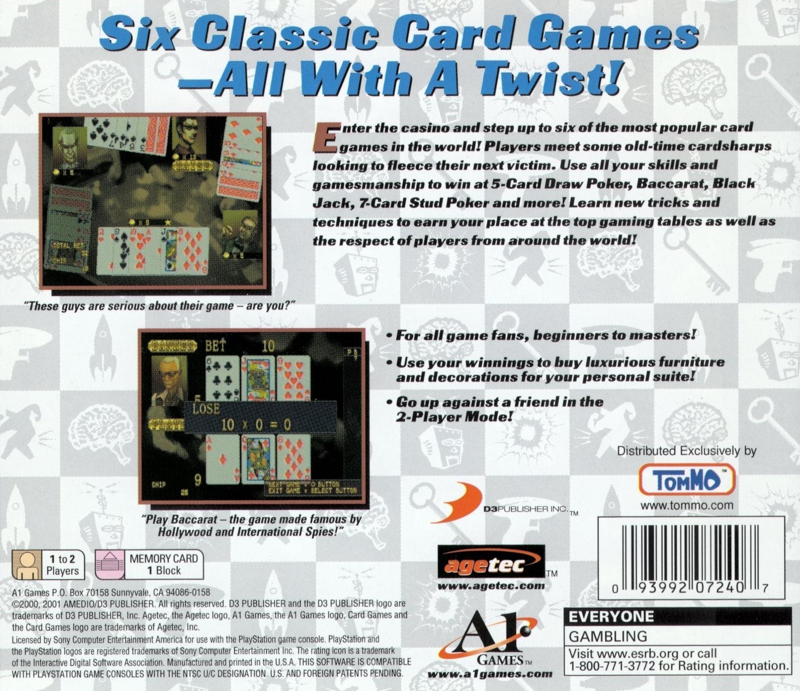 Enjoy a variety of classic card games with Card Games for the Playstation. This compilation brings a collection of timeless favorites to your console. Test your skills and luck in games like Poker, Blackjack, and more. With its simple interface and straightforward gameplay, it's a relaxing and enjoyable way to experience these enduring classics.