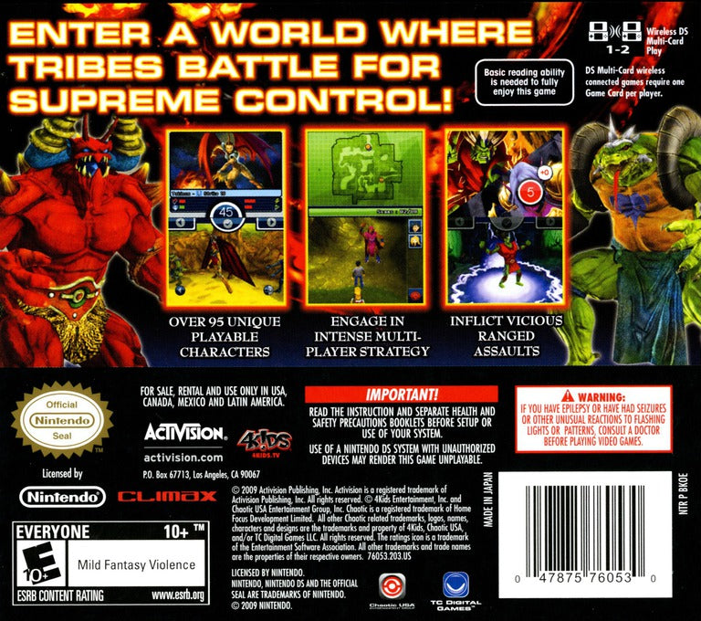 Bring your favorite collectible creatures to life in Chaotic: Shadow Warriors for the Nintendo DS. Based on the popular trading card game and animated series, this title blends tactical turn-based combat with RPG elements. Journey through the world of Perim, collecting and battling with over 40 different Chaotic creatures. Assemble your army, strategically equip them with powerful BattleGear and awesome Mugic spells, and challenge your foes in exciting arena battles. For fans of the show, it's a brand new adventure to prove you are the ultimate Chaotic player.