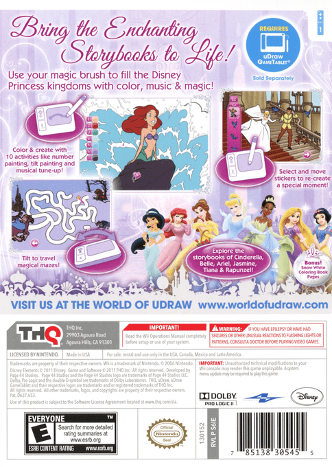 Step into a world of fairytales with Disney Princess: Enchanting Storybooks for the Wii. This interactive game lets you become the heroine in the stories of Ariel, Belle, Cinderella, Jasmine, Rapunzel, and Snow White. Use the uDraw GameTablet (sold separately) to color, draw, and solve puzzles as you help the princesses achieve their dreams. It's a creative and engaging experience for Disney Princess fans.