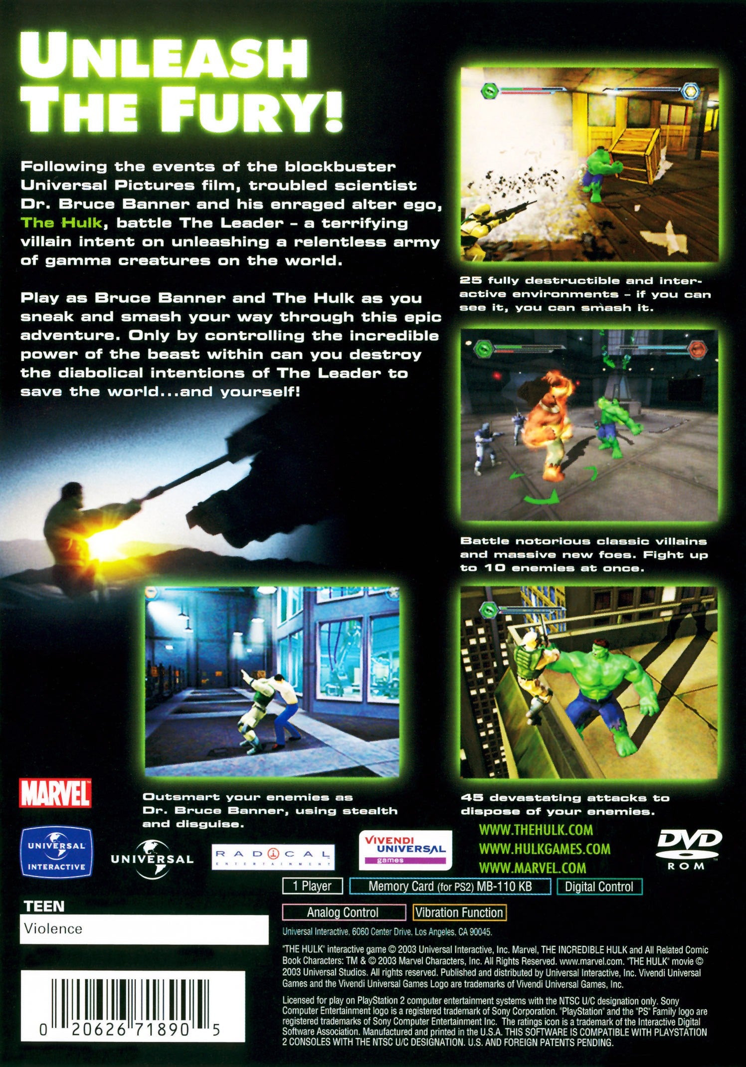 Hulk Smash! Unleash the incredible power of the Hulk in this action-adventure game for the Playstation 2. Based on the movie, you'll transform between the brilliant scientist Bruce Banner and his monstrous green alter ego. As Banner, solve puzzles and utilize stealth. As the Hulk, unleash devastating rage-fueled attacks, leap across rooftops, and battle powerful enemies like the military and gamma-mutated creatures. Can you control the beast within?