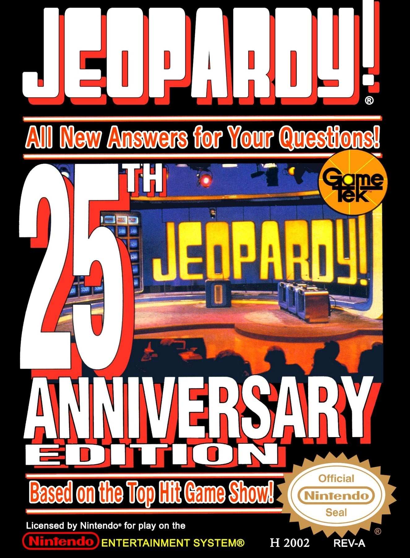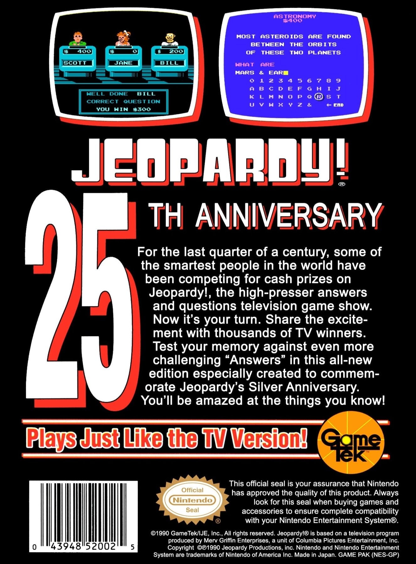 Celebrate a television milestone with Jeopardy! 25th Anniversary Edition for the NES. This special version of the classic quiz show game features updated questions and categories, commemorating 25 years of America's favorite answer-and-question program. Compete against AI opponents, test your trivia knowledge, and strive to become the ultimate Jeopardy champion in this nostalgic retro title.