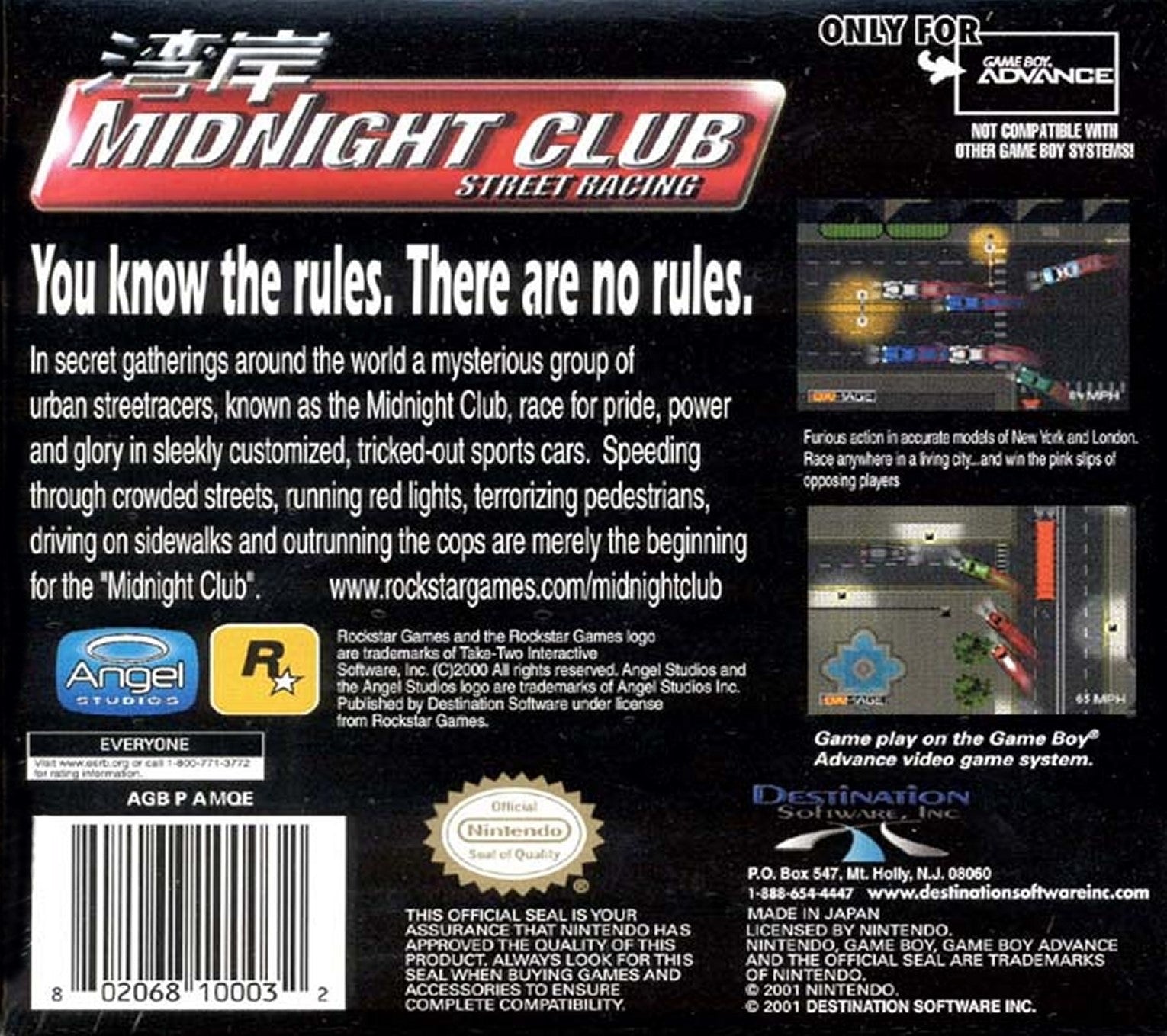 Experience the thrill of illicit street racing on the go with Midnight Club: Street Racing for the GameBoy Advance. Choose from a variety of customizable cars and compete in high-speed races through urban environments. Navigate traffic, find shortcuts, and outmaneuver your opponents to become the top street racer. This handheld title delivers fast-paced arcade racing action in the palm of your hand.