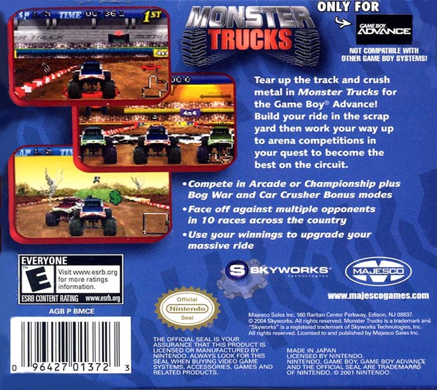 Get behind the wheel of powerful off-road behemoths in Monster Trucks for the GameBoy Advance. Compete in challenging races across rugged terrain, performing massive jumps and navigating treacherous obstacles. Choose from a variety of monster trucks, each with unique attributes, and strive for victory in this action-packed handheld racing experience.