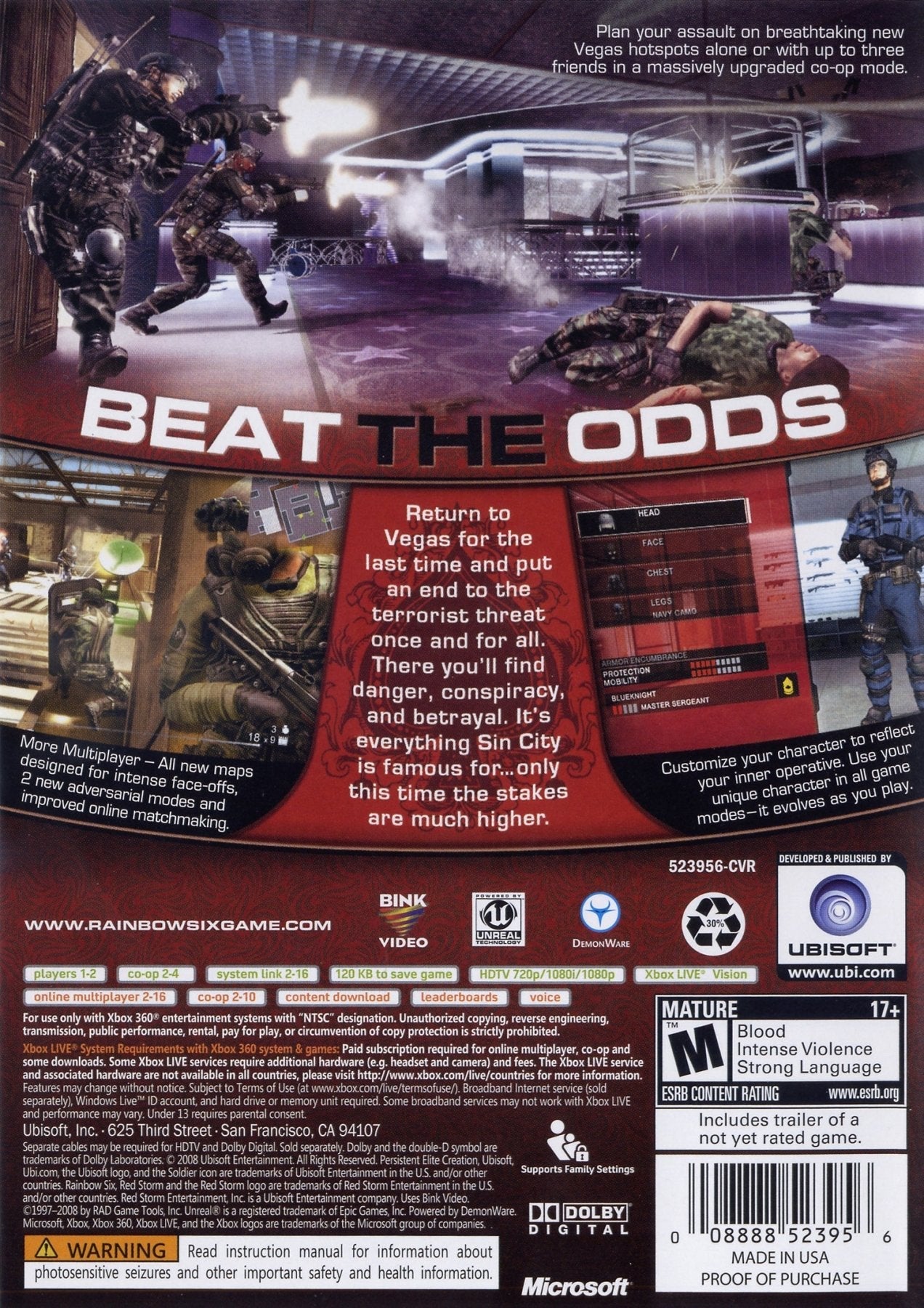 Return to the high-stakes world of counter-terrorism in Tom Clancy's Rainbow Six Vegas 2 for the Xbox 360. Create your own personalized operative and experience a compelling storyline that intertwines with and concludes the events of the original Rainbow Six Vegas. This tactical first-person shooter features refined gameplay, an improved persistent elite creation (PEC) system for character progression across single-player and multiplayer, and new weapons and customization options. With its robust cooperative and adversarial multiplayer modes, Rainbow Six Vegas 2 offers a deeper and more polished tactical shooter experience.