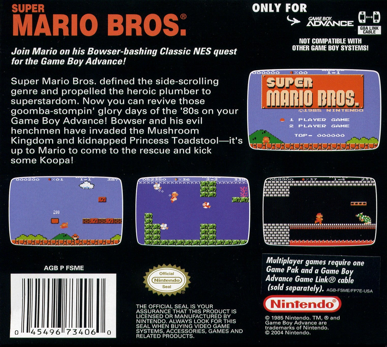 Relive the adventure that started a legend with Super Mario Bros. [Classic NES Series] for the GameBoy Advance. This faithful port brings the original 1985 NES masterpiece to your handheld, allowing you to guide Mario (or Luigi) through the Mushroom Kingdom to rescue Princess Toadstool from Bowser. Stomp on Goombas, collect Super Mushrooms and Fire Flowers, and navigate iconic levels filled with pipes and hidden secrets. Experience the timeless 2D platforming gameplay, memorable music, and charming 8-bit graphics that captivated millions and defined a generation of gaming, now perfectly portable.