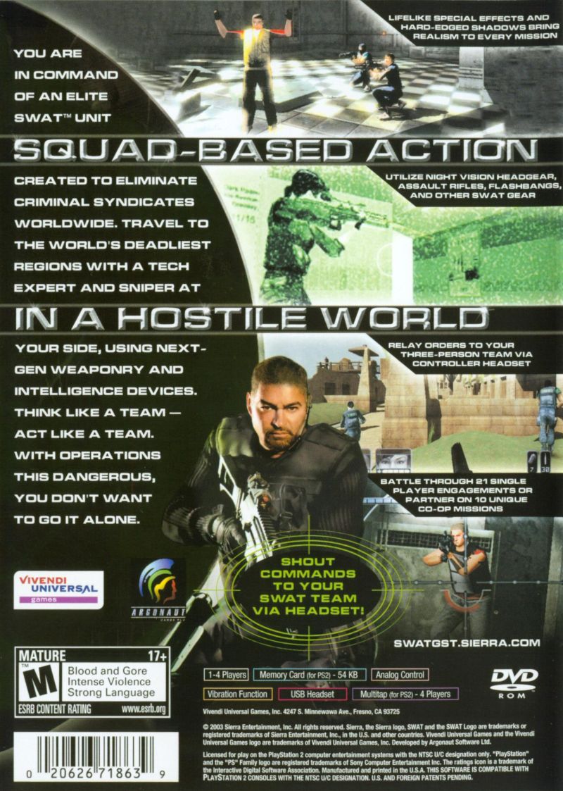 Lead an elite counter-terrorism unit in SWAT: Global Strike Team for the Playstation 2. This first-person tactical shooter puts you in command of a three-person SWAT team, tasked with neutralizing threats across various global hotspots. Issue commands to your AI squadmates, utilize authentic weaponry and equipment, and engage in strategic room clearing and hostage rescue operations. With its focus on realistic tactics, teamwork, and challenging mission objectives, SWAT: Global Strike Team delivers an immersive and intense law enforcement experience for fans of tactical shooters.