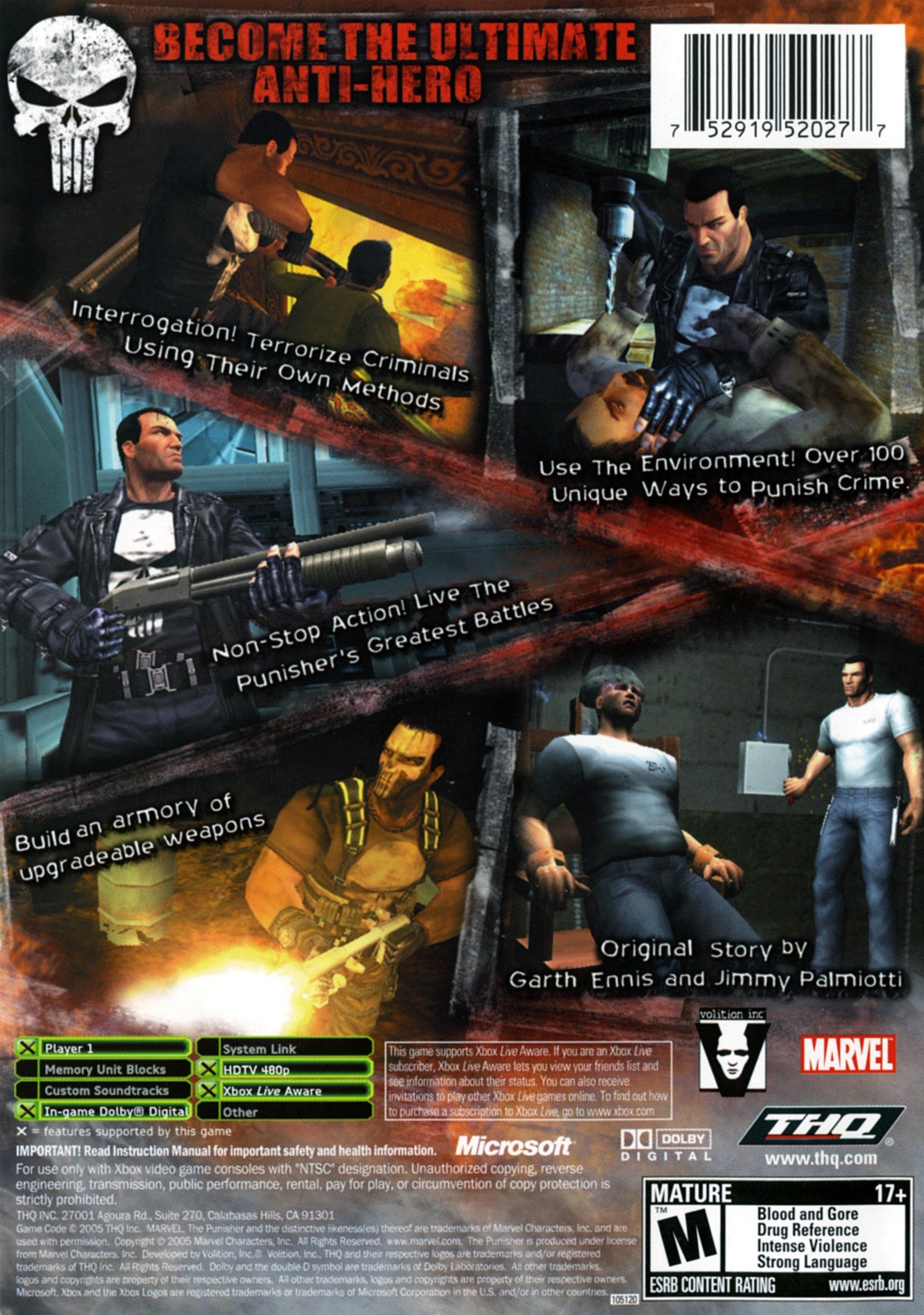 Become the ultimate vigilante, Frank Castle, in The Punisher for the Xbox. This dark and brutal third-person action game immerses you in a gritty criminal underworld. Utilize an extensive arsenal of firearms, melee weapons, and environmental objects to eliminate your targets. Employ unique and often gruesome interrogation techniques to extract information from uncooperative foes. With its mature themes, visceral combat, and storyline inspired by the comic books, the Xbox version delivers an intense and graphically detailed (for its time) interactive experience of Punisher's relentless war on crime.