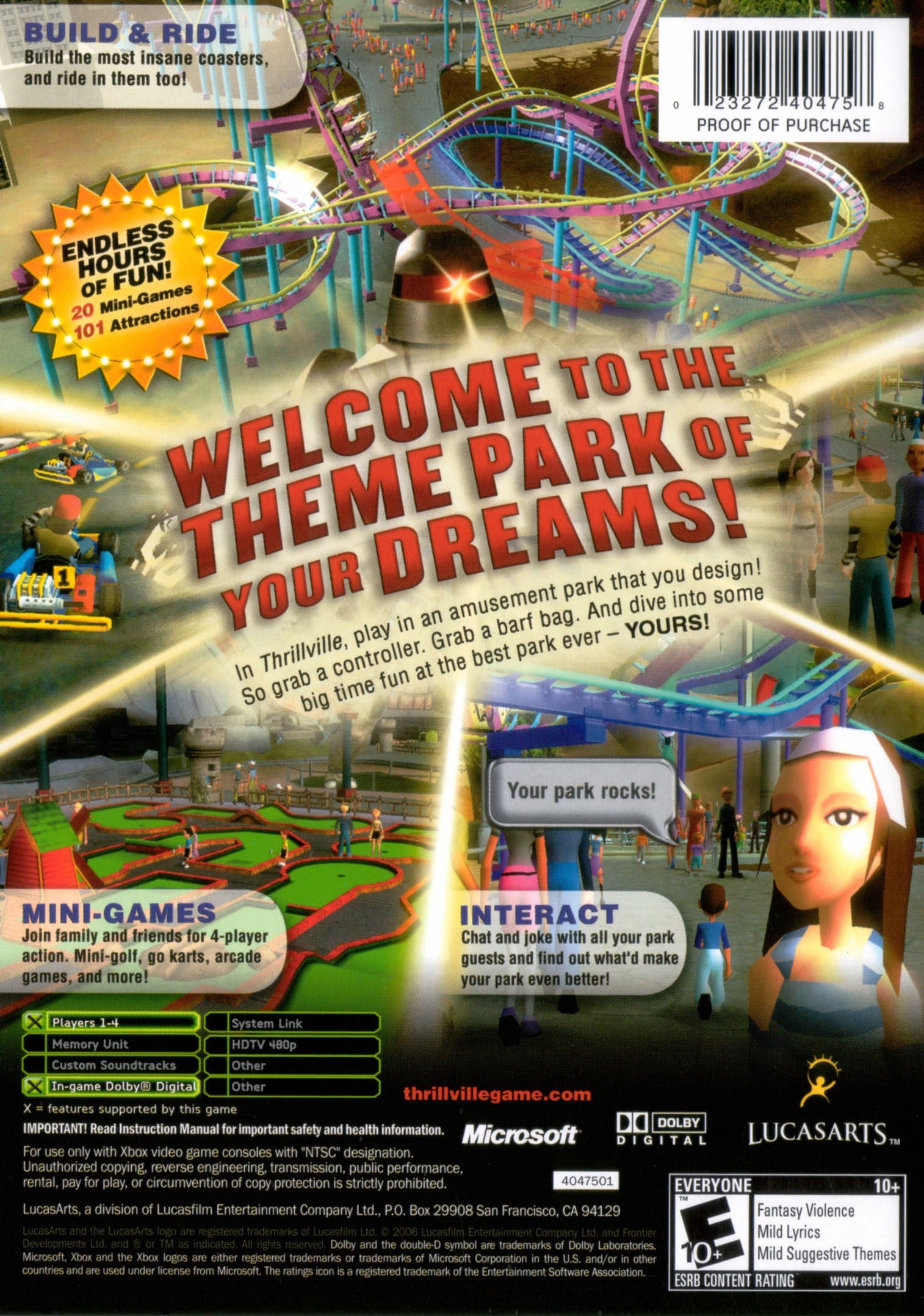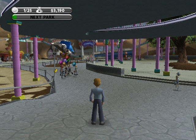 Build and manage the amusement park of your dreams while also enjoying its attractions in Thrillville for the Xbox. This engaging simulation game allows you to design incredible roller coasters with an easy-to-use editor, place a wide variety of rides and stalls, and then interact with your park guests by chatting with them and even playing your own rides through fun mini-games. Complete missions, manage finances, and strive to create the ultimate entertainment destination. The Xbox version features enhanced graphics, bringing your vibrant theme park to life.